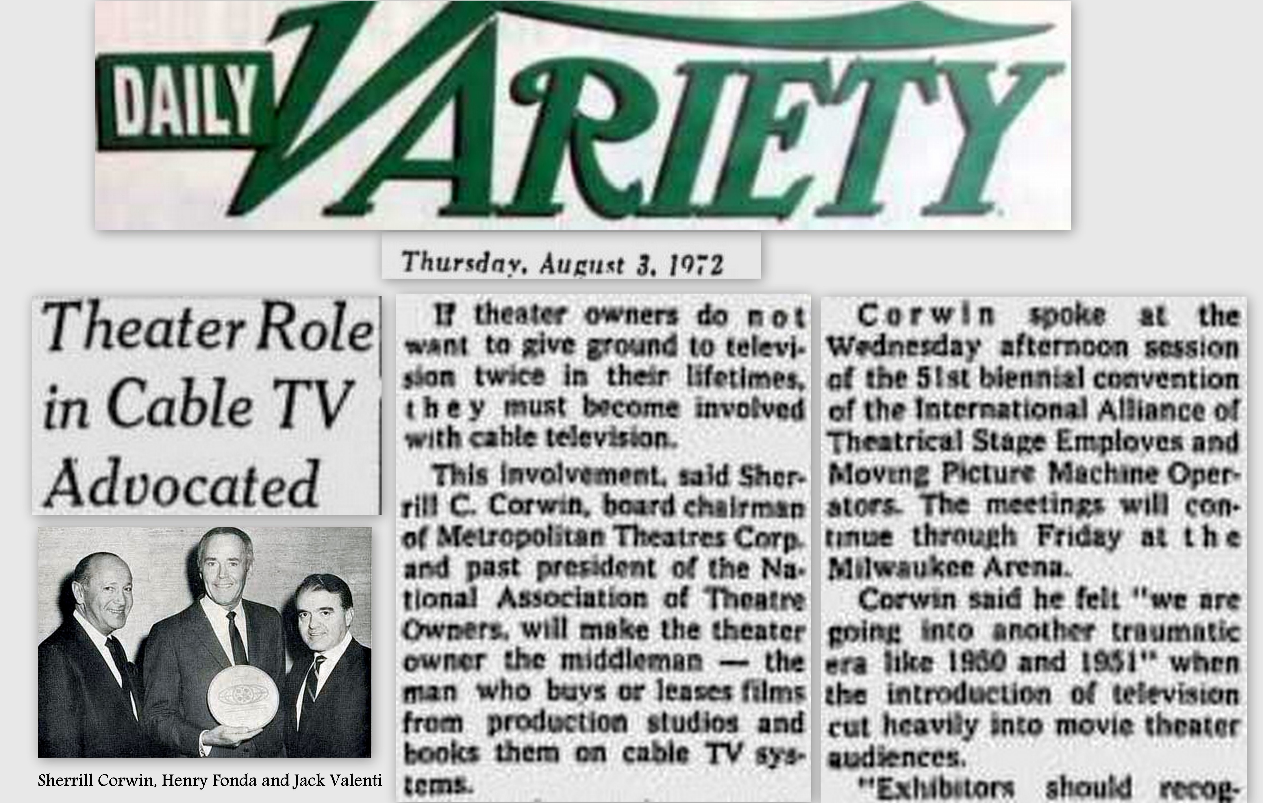 I was amazed that despite its potential, pay cable had few friends. Notwithstanding Sherrill Corwin’s endorsement of the concept, and encouragement from the studios and the guilds, movie theatre owners hated the idea and the TV networks were certainly opposed to anything in television that might syphon audiences away from their program schedules. Network affiliated TV stations as well as the independents were terrified that pay TV might lead to the demise of advertiser supported ‘free’ television.