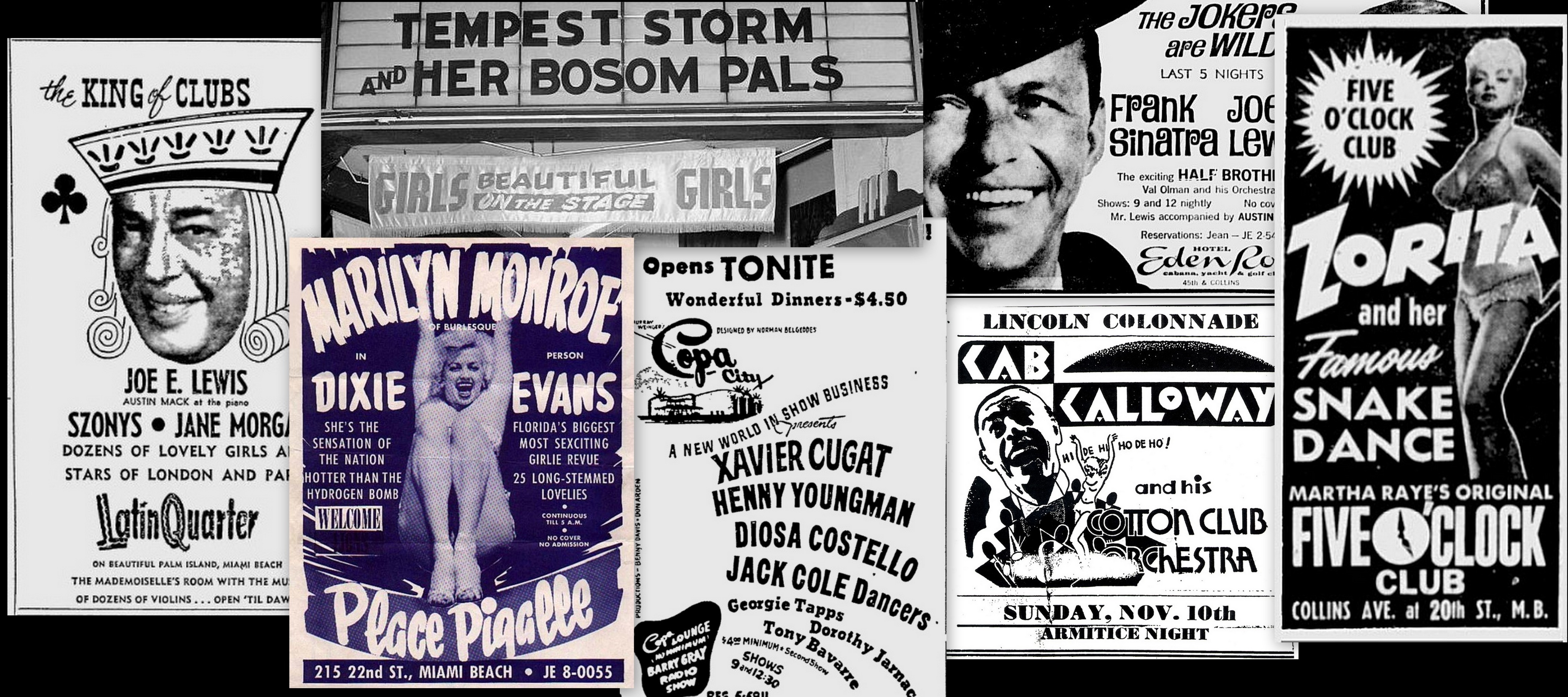 Miami was famous for its nightlife. Leon and Eddie’s, Club Morocco, the Copacabana, the Deauville, the Macamba, the San Souci and the Latin Quarter featured entertainers such as Harry Belafonte, Lena Horne, Hildegarde, Patti Page and Xavier Cugat, as well as Catskills comedians including Milton Berle, Myron Cohen, Henny Youngman, Lenny Bruce, Don Knotts and the Ritz Brothers. Jackie Gleason was a fixture at the Kenilworth. All were out of our league.